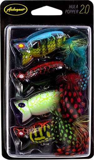Arbogast Hula Popper 2.0 4 Pack This four-pack brings anglers the four original patterns introduced in the Hula Popper 2.0 in one package. The 2.0 has the same classic popping action as the original Hula Popper, but with unique additions like a feathered treble and crackled patterns.