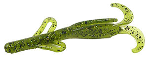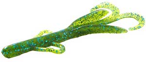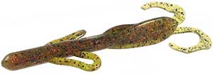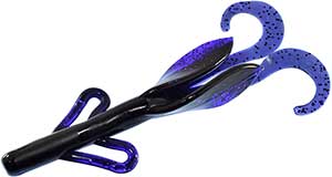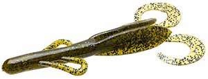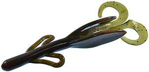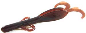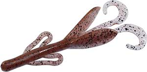 The Zoom Brush Hog is the favorite of many across the country. This bait is large (6"), but falls slowly because of its wing-like features on the side. Combined with a double tail on the back, this bait puts lots of vibration out and can call fish even in murky water. This is most often fished on a Texas rig, but also is gaining popularity on the Carolina rig. A very versatile bait that is used by many as their "go to" bait.