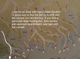 By David Heinke There is an old saying that ninety percent of the fish can be found in ten percent of available water. That might help describe why it seems like you're fishing in the Sahara Desert while your buddy is knocking them dead only twenty feet away! As in real estate, location is everything! The location you want to find is the one with all the fish. To find that location, you need to find the available structure. Structure can take many forms. From the obvious items like; shipwrecks, submerged trees and big rocks, to areas more subtle like oyster bars, channels through flats, and sometimes just a small pile of rocks. All of these locations will hold fish, some more than others, but the size of the structure will help determine how many fish might be in a given area. A depth sounder is an excellent tool to help learn what the bottom looks like in a given area. Tidal creeks and river mouths tend to be an excellent source of structure. Many times, the creek channel will wind through areas of alluvial silt, known as deltas or flats. At high or slack tide, game fish will patrol these flats in search of prey. But when the tide starts flowing, game fish will move to the channels and wait for their meal to be brought to them. Game fish need only a few items to be happy; comfortable water temperature, cover to hide from predators or to ambush prey and of course a supply of food. Think about humans for a moment and lets pretend that we're aliens on a human angling trip. If we observe the humans, after a while we would learn there are three times a day when humans feed, morning, noon, and evening. Hungry from their rest, humans will usually try to find something to eat in the mornings. A wise angler would try pancakes or eggs as bait. As the day progresses and the temperatures warm, humans will slow down and not eat as heavily as in the morning or the evening, so a smaller bait like a sandwich or bagel might work best. At dusk, human activity begins anew until the sunsets. To lure the biggest humans during the evening feed, a steak or fried chicken might just land you a lunker. At night, human angling will result in an abundance of the more youthful lively specimens. The large and older humans are harder to catch because they only make brief appearances outside their homes and tend to be more wary about from where their food comes. Fish do not vary much from the above patterns and given that, the best time to angle for fish would be the times when they are away from their cover and feeding. It takes some observation and experience, but soon you will be able to determine the best place and times to fish. Keep in mind the following observations I have made when fishing tidal creek mouths. Aside from pelagic species, most fish do not move far from home. When a fish is feeding, it also exposes itself to predation. As a result, the fish will tend to be more wary while feeding. Fish will prefer to find a home that provides good cover from predators, a nearby source of food and water deep enough to hold in order to accommodate water temperature changes. If a fish has found a place with good tidal flow, then it doesn't have to waste much energy swimming around looking for food. The tides deliver food to the fish. When fishing in current, remember game fish will swim and face into the current. The food will flow to them so it is best to present your bait with the flow. The better the home, the bigger more aggressive the fish will be. Smaller fish will be either eaten or driven out by the bigger fish. If the area is large enough, many fish will gather for the cafeteria style feeding the tides bring. If there is an obvious item of structure within the creek, such as a tree stump or large rock this will be an excellent area to try for a larger fish. The current will slack and eddy around the structure and a fish holding in the eddy will expand less energy than a fish holding directly in the current. Now that we have a better idea of where and why fish hold in certain areas, lets take a look at how to locate these areas. The first step is to obtain a chart of the area where you want to fish. If a chart is not available, then it might be a good idea to hire a local guide for a day. The knowledge obtained in one day with a guide might take several years to learn on your own. However, if you must go at it alone, then try to find a chart with depths and bottom contours if available. Below is an example of an area where a river flows into a bay along with many tidal creeks. An area that looks like this is a prime area to check out for fish. Also, obtain an accurate tide table for the area. Many are available on the Internet, but you might be able to obtain a tide table in a booklet form that will cover anywhere from a year to several years. Don't just take the tide table for granted, also be aware that atmospheric conditions can alter tides. If a strong wind is blowing against or with a tide, the effects will be increased or reduced depending on whether it is ebbing or flooding. Unfortunately there isn't a book that tells you this, you must learn how the winds affect the tides by experience. In the chart below, we can take a closer look at the same area and focus more upon where to start fishing. The best rule of thumb-and there are always exceptions to the rule-is the best fishing will occur in the creek mouths when the tide is flowing strongest. The middle third of a tide will produce the best flows, while the beginning and end of each tide will have weaker flows until slack-or no flow-tide is reached either at the top or the bottom of the tide. During high tide, it might be a good idea to drift over the flats and cast at fish cruising the flats in search of prey. Also, fish will swim into the creeks and bays in search of food and it would be wise to do the same. At low tide, concentrate on the deepest parts of the river channels or in the pools found amongst the flats. A great way to help find fish fee